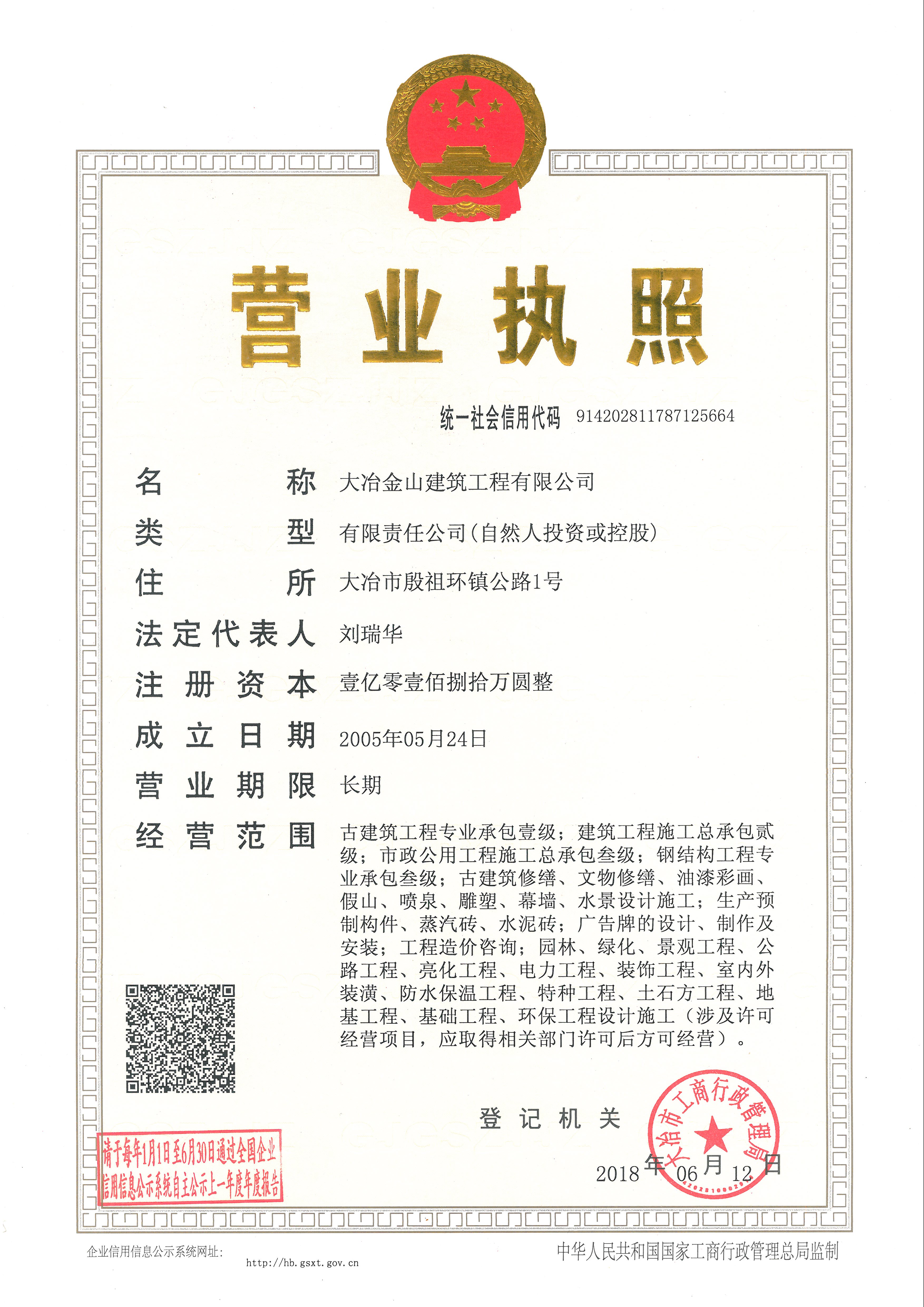 大冶金山建筑工程有限公司始建于1984年,屬鎮辦集體企業。1997年改制為大冶山建筑工程有限責任公司,屬股份制企業。2013年更名為大冶金山建筑工程有限公司,2018年3月公司資源重組,公司注冊資金達到10180.00萬元,公司法定代表人為劉瑞華。公司具有古建筑工程專業承包壹級、建筑工程施工總承包貳級、市政工程總承包叁級、鋼結構工程專業承包叁級資質。